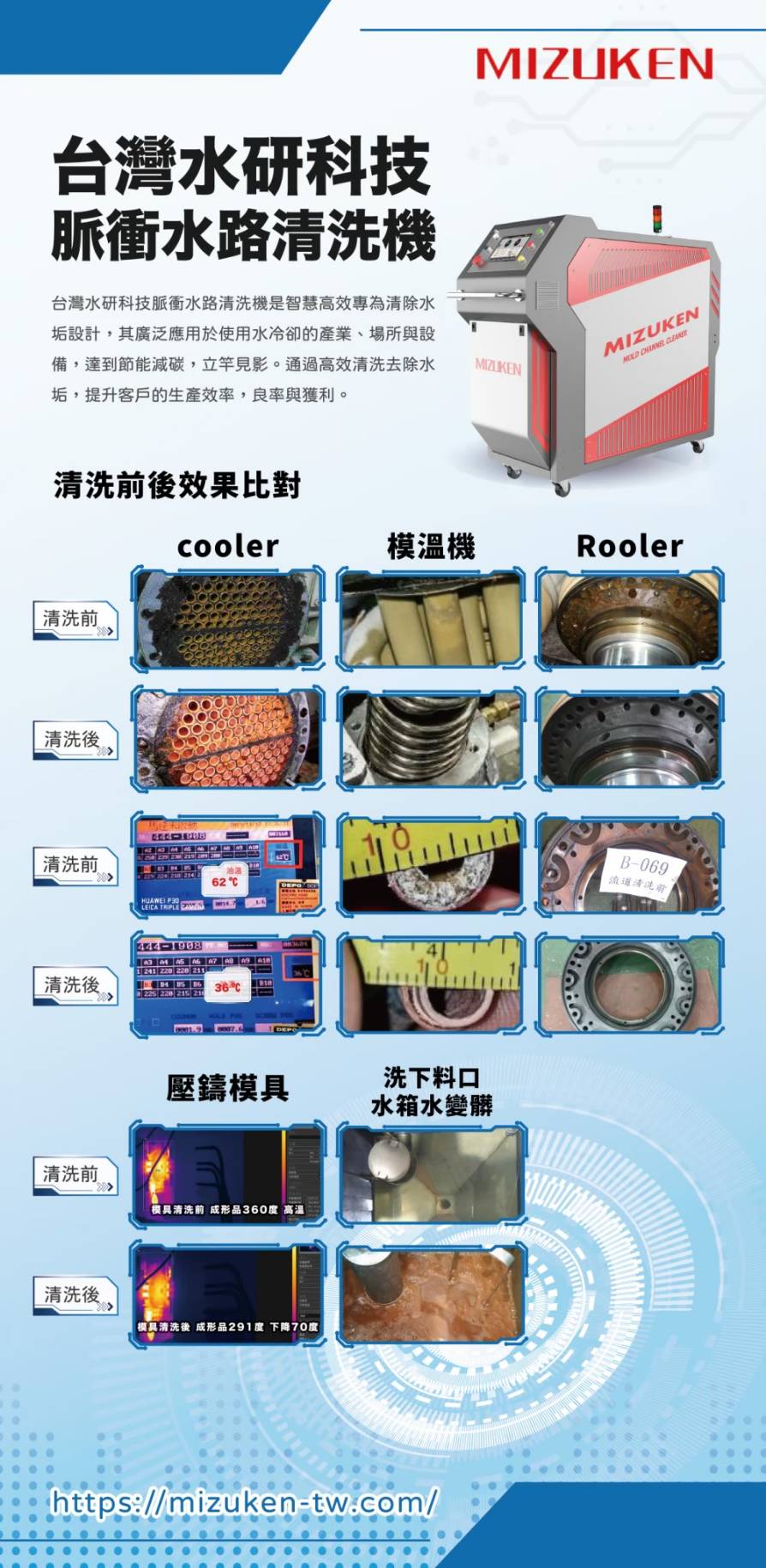水研科技是智慧高效清除水垢的專業設備製造企業,廣泛應用於舉凡使用水冷卻的產業、場所與設備,達到節能減碳,立竿見影。通過高效的清洗去除水垢,立即提升客戶的生產效率,良率與獲利。讓相關產業客戶如塑膠射出、押出、壓鑄,節能減碳、立竿見影,保持或成為全球市場中的佼佼者。
